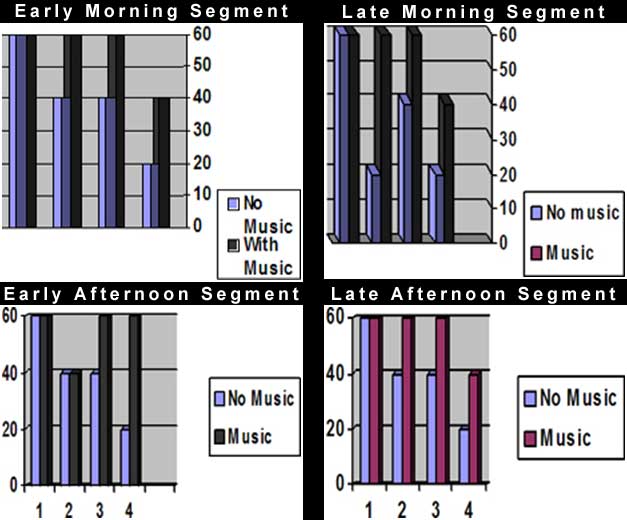 - Student number three improved to above average behavior while student four improved to moderate behavior. The morning segment indicated that each student improved their behavior patterns with the playing of classical music.